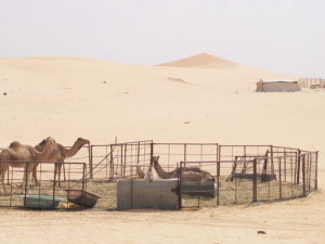 ラクダは、『砂漠の舟』とも呼ばれ、砂漠の多いサウジアラビアでは自動車が普及するまで重要な交通手段でした。ラクダは一度で80リットル以上の水を飲むといわれていますが、その水はこぶではなく血液の中に蓄えられます。そのため、ラクダは暑い気候の中でもほとんど水を飲まずに、2・3日間は動くことが出来ます。ラクダの背中のこぶの中には脂肪が蓄えられていて、エネルギーとして使われたり、暑さから体を守る断熱材として使われたりします。ラクダは砂漠で荷物や人を運んだりするだけでなく、肉を食べたり、皮はなめして使われ、織物に使われたりします。